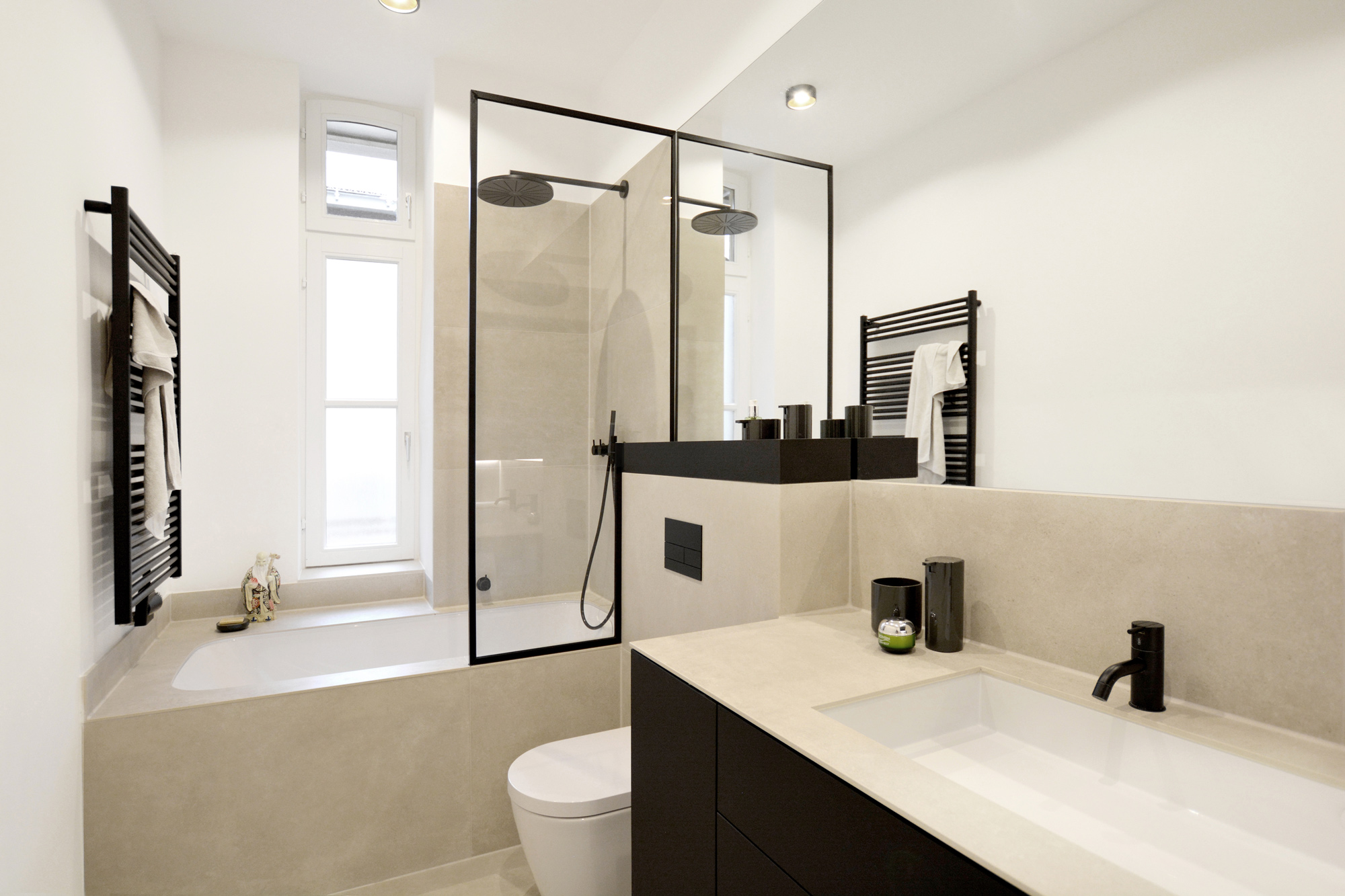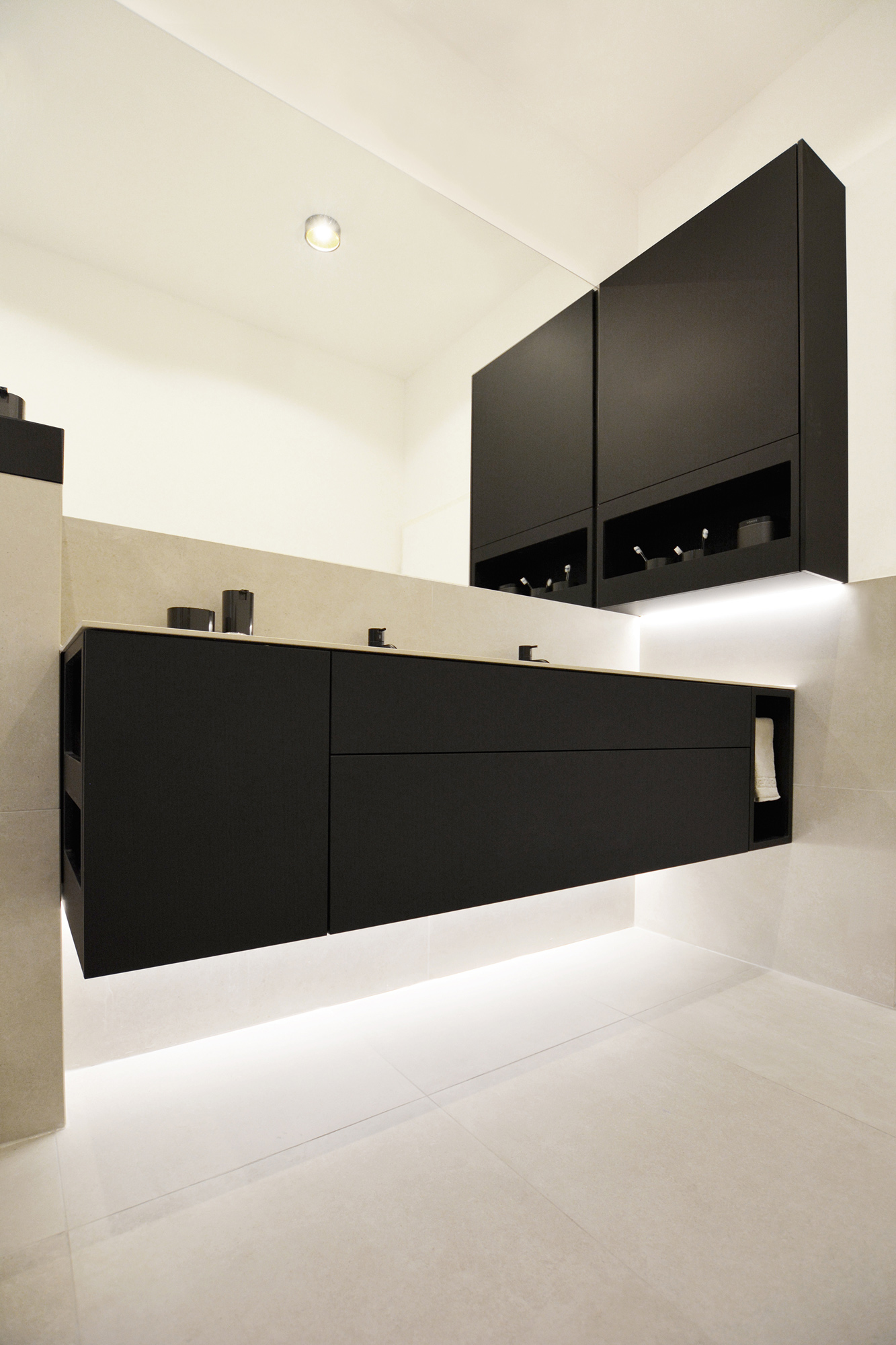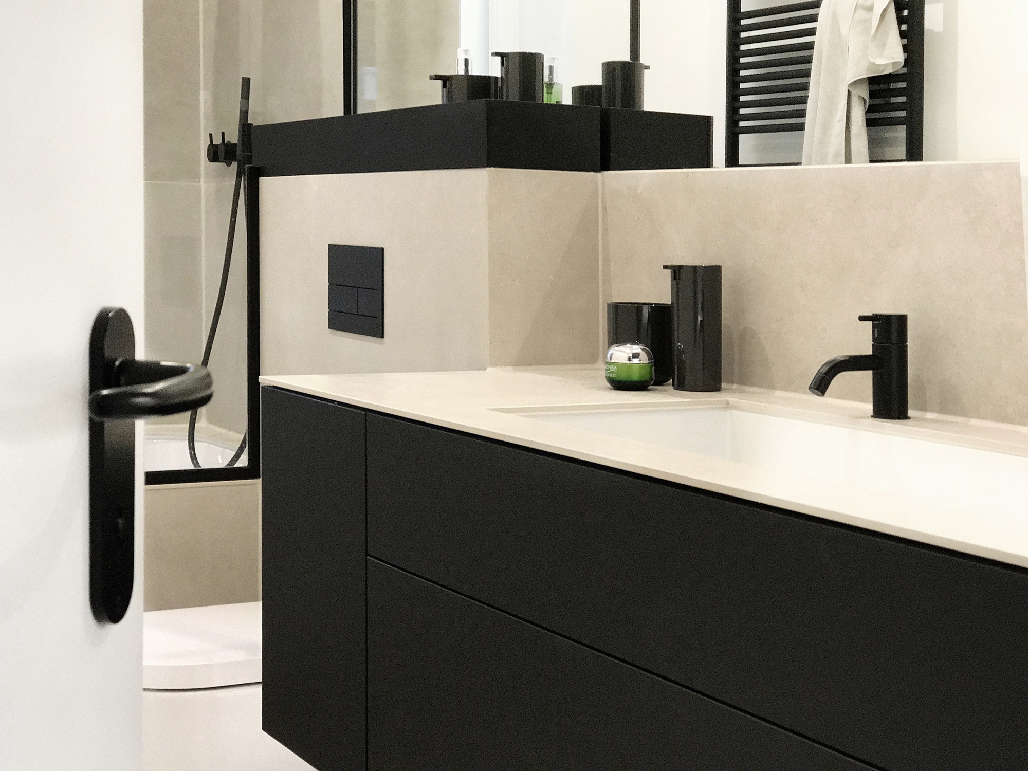Diesen Bad-Ausbau haben wir mit Fenix-Verbundplatte ausgeführt.