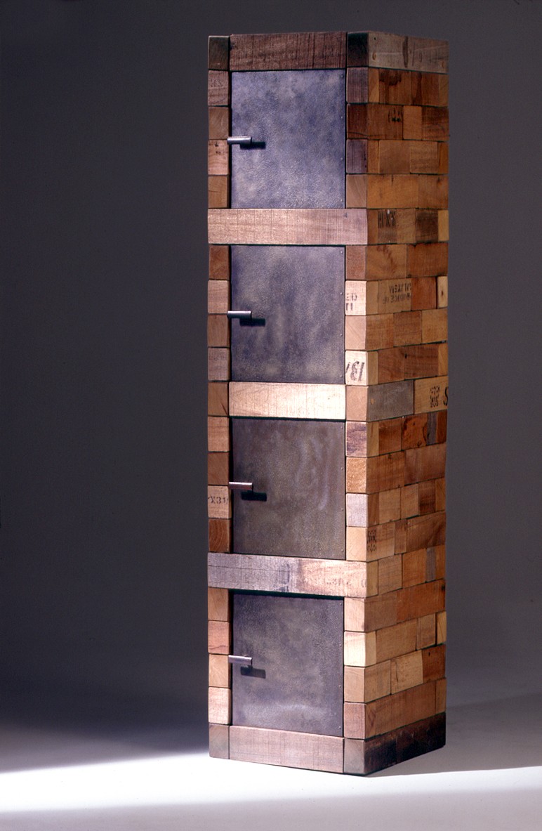 Nicht kleckern, Klötzchen! Schrank aus Meranti-Abfällen gemauert. Die Türen sind aus patiniertem Stahl.
