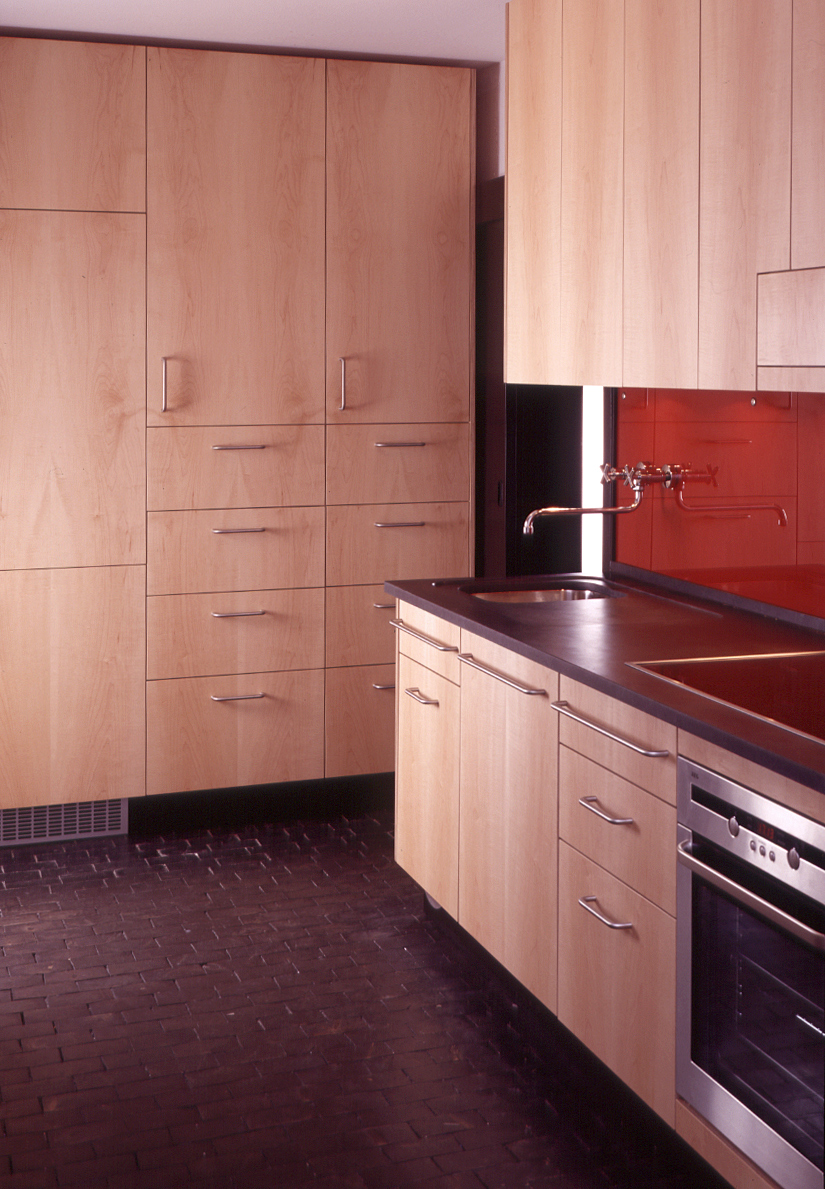 Die Arbeitsplatte dieser Küche ist aus Granit (Nero assoluto, matt geschliffen). Das Glas des Fliesenspiegels ist auf der Rückseite farbig lackiert. Die Türen und Blenden sind aus Ahorn furniertem Multiplex gefertigt.