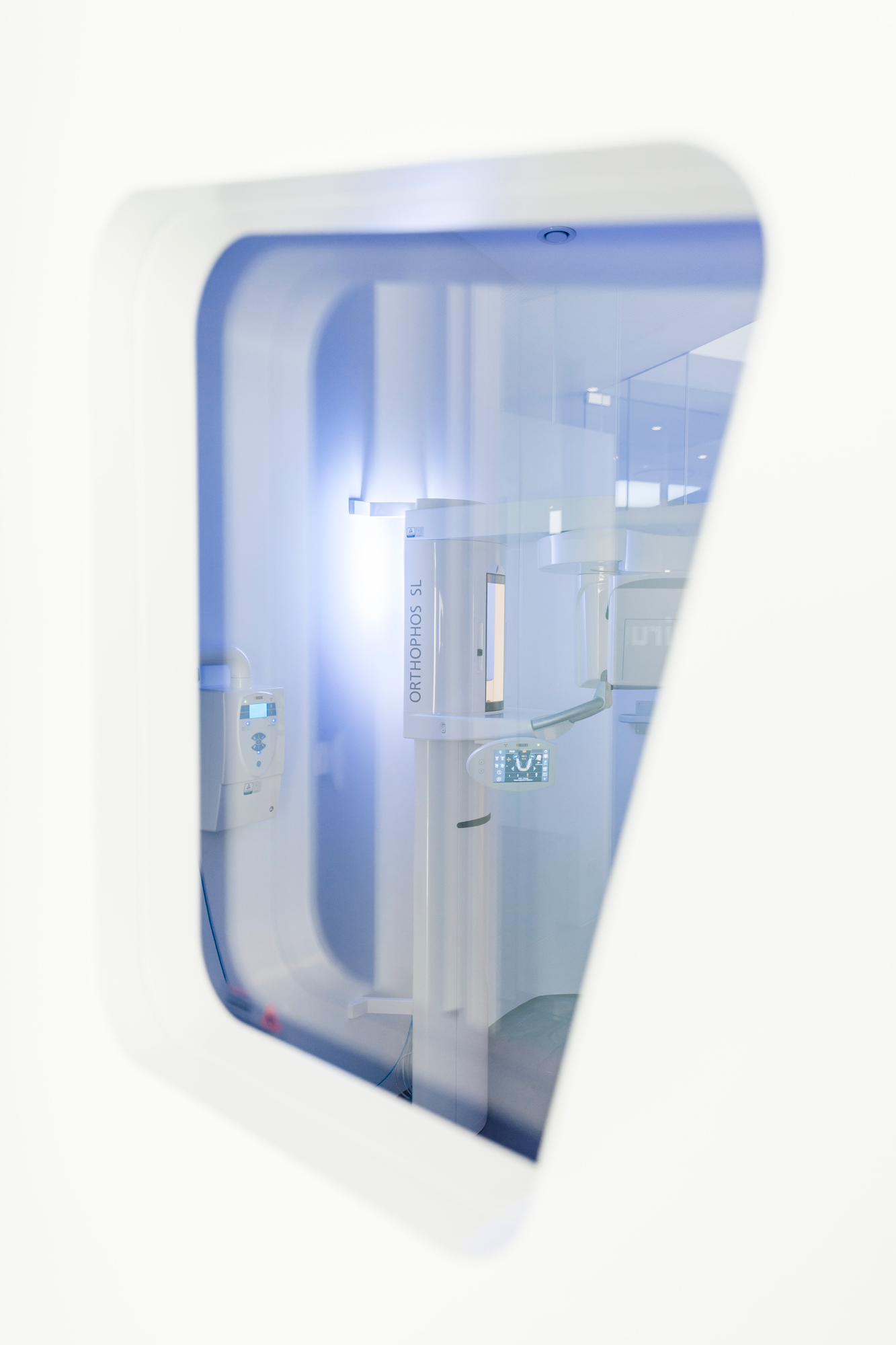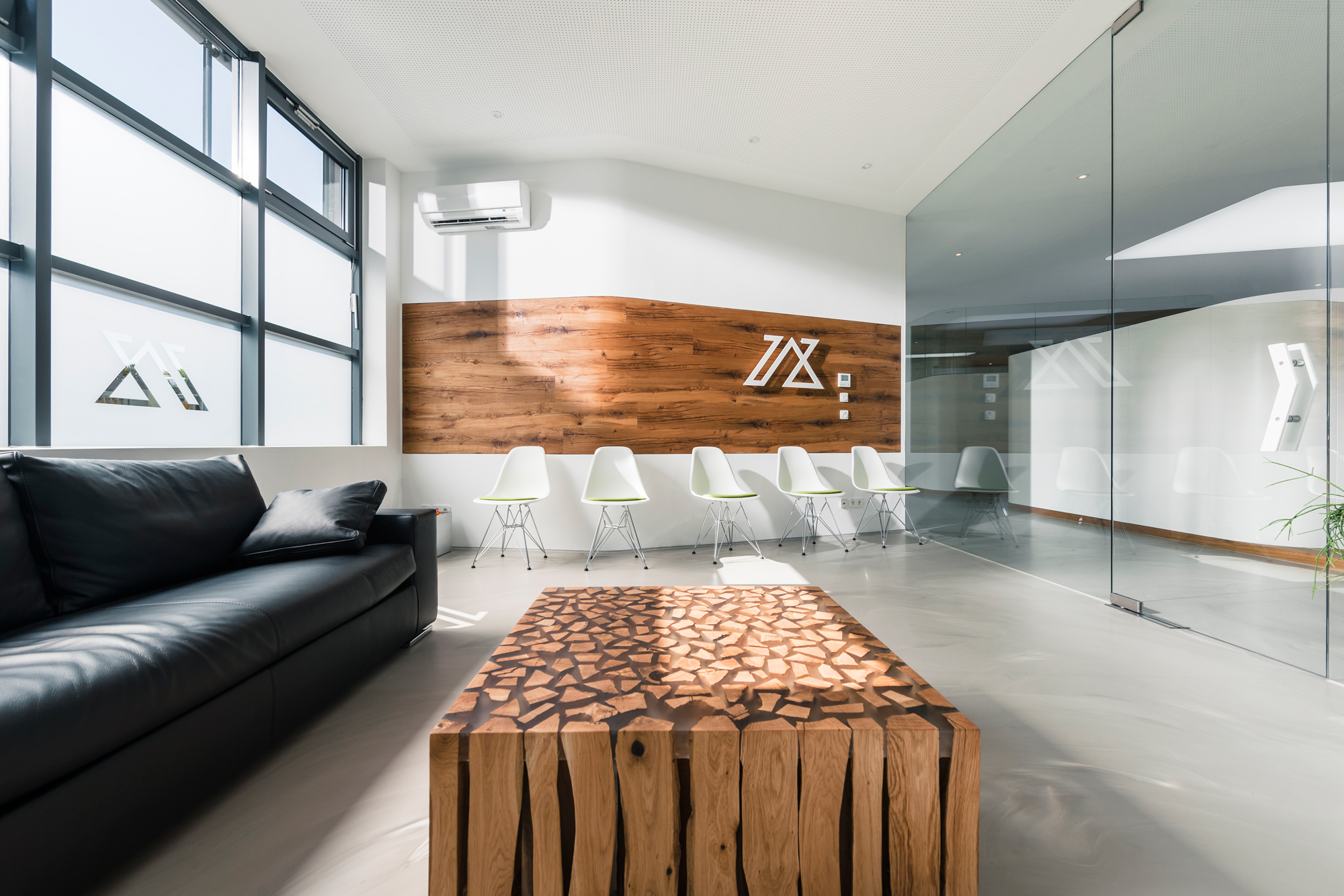 Mit erheblichem Aufwand wurden hochwertige Materialien wie z.B Glas bei den Oberlichtern und Corian bei der Empfangstheke, dem hinterleuchteten Praxislogo und den Glastürgriffen unter Hitzeeinwirkung verformt bzw. mit Hilfe von CNC Bearbeitung gefertigt. Gerundete Raumwandelemente wurden in Sandwichbauweise hergestellt und mit Hilfe von CNC gefertigten Hilfsformteilen mittels Vakuumpresse in Form gebracht.
