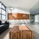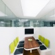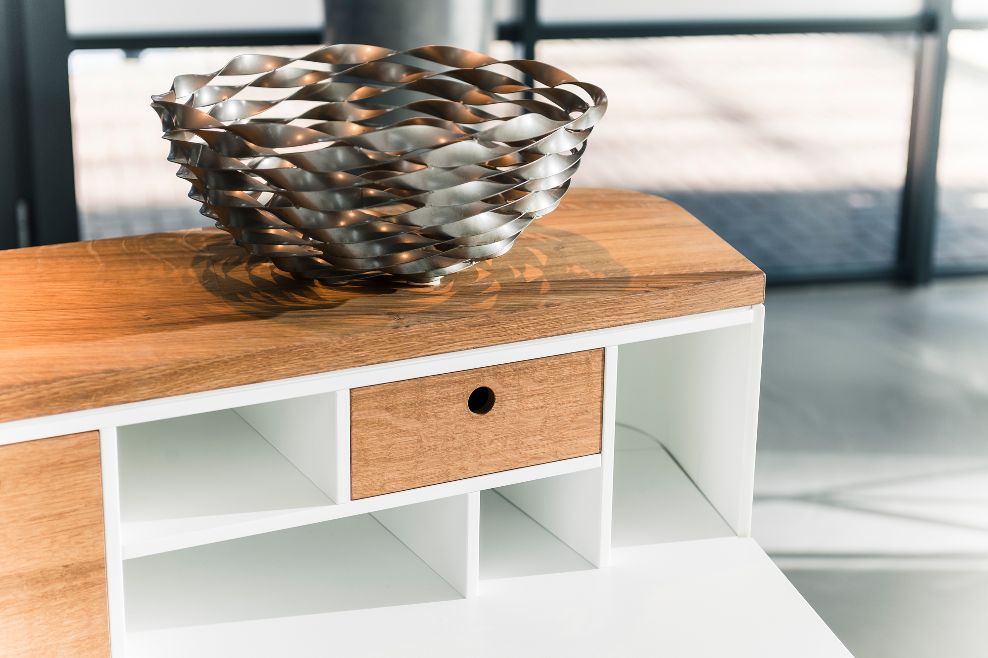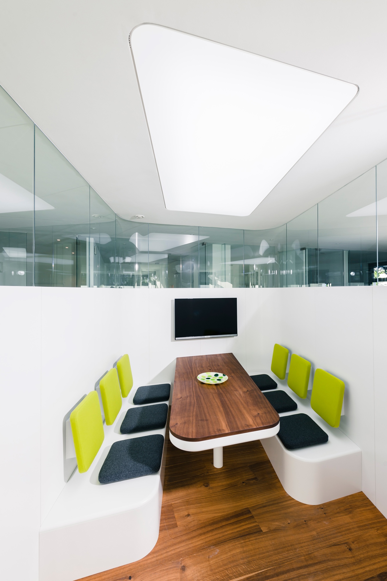 Neben Glas und Corian kam u.a. geölte, rustikale Eiche zur Verwendung, z.B. für die handwerklich gefertigten Bodendielen oder der Tischplatte des Besprechungstisches, Elemente, die eigens in einer „Räucherkammer“ auf den gewünschten Farbton geräuchert wurden. Für dekorative Wandverkleidungselemente wurde Eichefurnier verwendet, welches aus alten, Eichenkonstruktionsbalken gemessert wurde. Der überwiegende Teil der Ein- und Ausbauten wurde aus weiß lackiertem MDF-Material gefertigt.