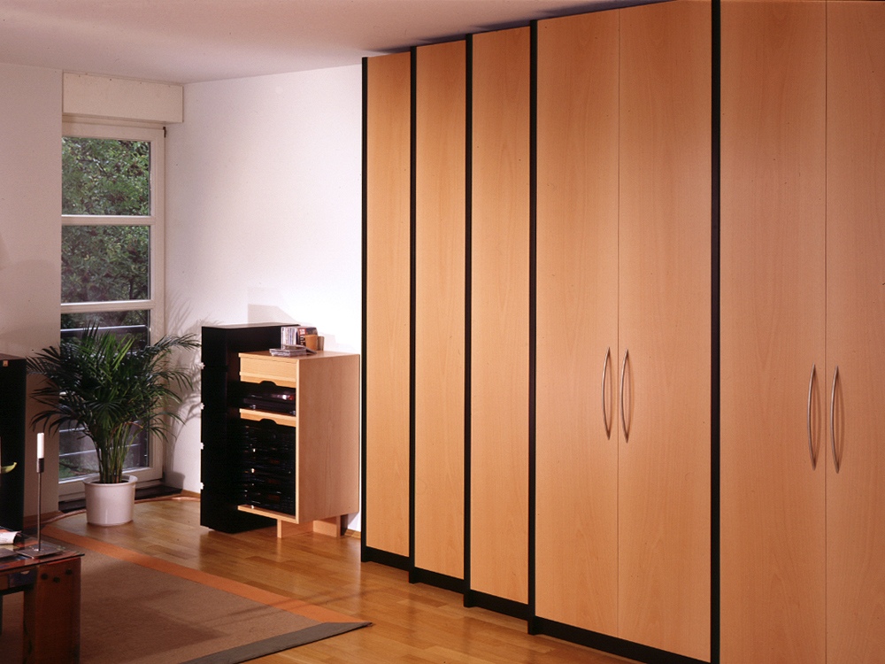 Die Pullis in den schmalen Teil, die Mäntel in den tiefen: Der getreppte Kleiderschrank bietet unterschiedliche Tiefen für unterschiedliche Funktionen. Aus Buche und schwarz lackierter MDF.