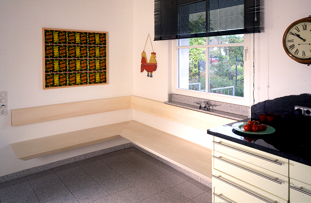 In der Schwebe: Die Küchenbank ist freischwebend montiert. Da gibt es kein Gestolper über Stuhlbeine. Aus massivem Ahorn, gebleicht.