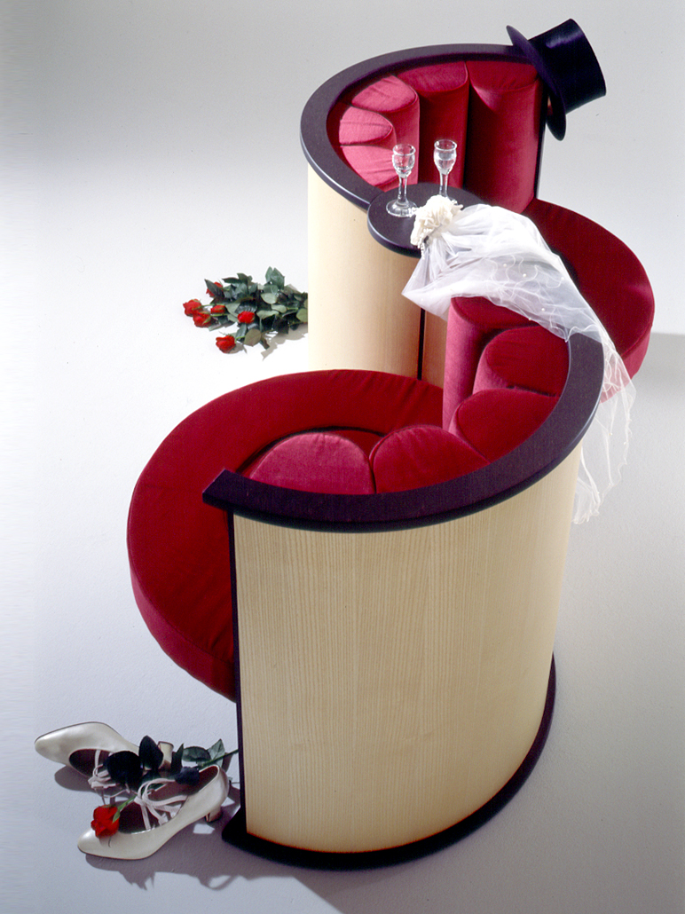 Eigene Wege gehen und/aber zusammensitzen! Vieles ist möglich, beiderseits offen ... Tête à tête auf weichem Grund. Vorgestellt bei der CASA-CANE-Ausstellung "Beziehungskisten" zur Int. Möbelmesse '99 in Köln.