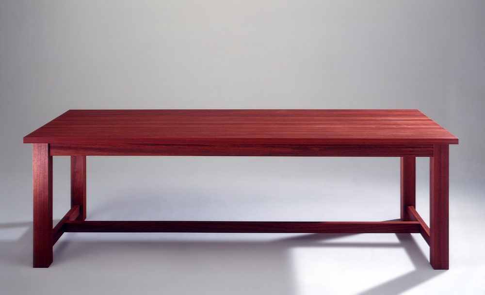 Rot und schlicht: Diese einfache Schönheit von Esstisch ist aus Paduk, massiv. Den Kontakt vermitteln wir gerne.