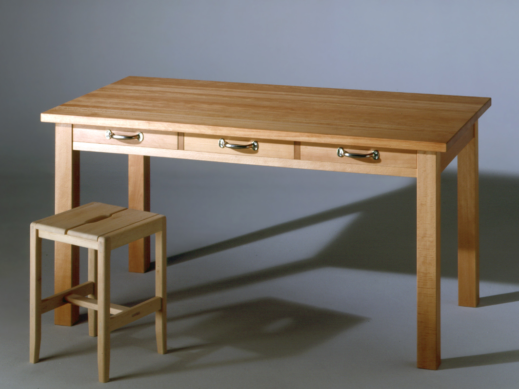 Volle Breitseite: Die drei Schubladen ziehen sich einmal quer durch den Küchentisch und sind beidseitig zieh- und befüllbar. Aus Buche.